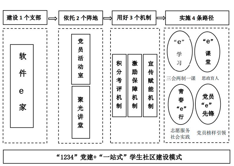 以学院公寓楼为单位,借助“一站式”学生社区的特点和优势,将支部建设形成特色品牌——软件“e”家,“e”兼具“一起、共同”和学院专业特色“互联网”之意,将党建带入“一站式”学生社区,实现党员在哪里,支部就建在哪里,宿舍在哪里,党建工作就覆盖到哪里。