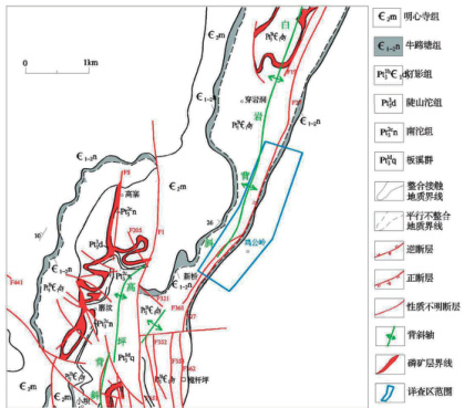 图 1 为勘查区地质构造简图,勘查区位于白岩背斜东翼,自背斜翼部向核部依次由新至老出露地层为寒武系下统明心寺组第一段、牛蹄塘组、震旦系上统灯影组二段上部,下伏灯影组二段下部、震旦系下统陡山沱组、南华系上统南沱组、青白口系清水江组呈隐伏状产出。