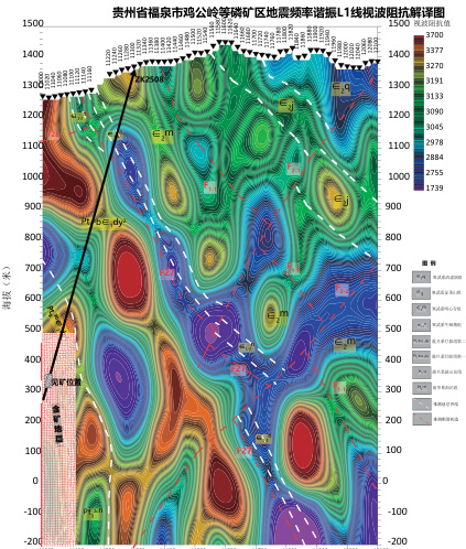 L1 线在 11300 点位处有已知见矿钻孔 ZK2508,其见矿深度为标高 300m-340m ,L1 线波阻抗解译图推断解译的含磷矿地层与已知钻孔基本吻合,推断解译的含磷矿地层往深部具有一定的延深,建议对推断的深部含磷地层进行钻探验证。