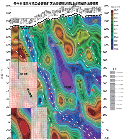 L2 线在 21100 点位处有已知见矿钻孔 ZK2902,其见矿深度为标高 600m-652m ,L2 线波阻抗解译图推断解译的含磷矿地层与已知钻孔基本吻合,推断解译的含矿地层往深部具有一定的延 深,建议对推断的深部磷矿层进行钻探验证。