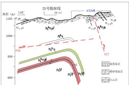 勘查区位于白岩背斜南倾伏端之东翼,总体为一单斜构造,地层倾向 110~140∘ ,平均 116∘ (图 2)。背斜构造形态完整,为一西缓东陡的斜歪背斜,轴面倾向 260-320∘ °,平均 296∘ ;倾角 65-80∘ ,平均 72∘ °。轴向北部为北北东 5∘ ,以南转向南西 218∘ ,平面上呈现一舒缓的“S”形。岩层倾角在西翼一般 12-35∘ ,东翼产状较陡,倾角在 46~78∘ °,北部 23 号勘探线近于直立。东翼地层产状北部较陡,南部较缓。