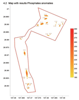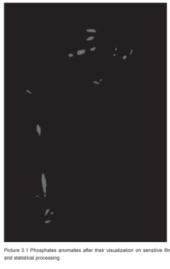 通过获取的卫星数据,在放射性实验室处理后得到勘查区的辐射通量数据,结合我们磷矿探测方面的建模背景值,在实验室取得了辐射通量异常显影图及经GIS 校准后的辐射辐射 通量异常图。
