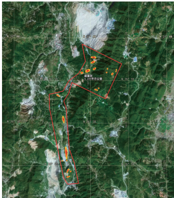 勘查区位于贵州省福泉市,面积 5.23km2 (图 3),探测勘查区范围内的磷矿资源在该地区的赋存情况,本次远程卫星探测共圈定磷矿异常区19 处,为下一步的地质勘查工作提供了找矿依据。