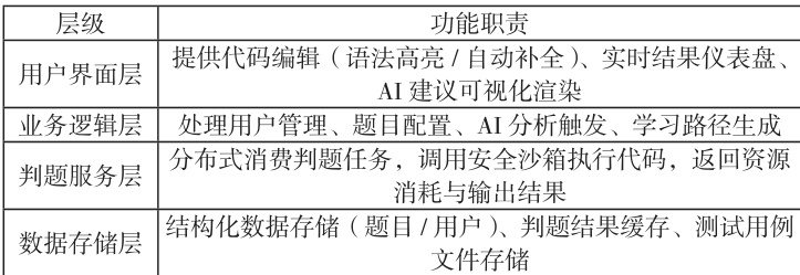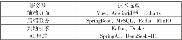 本系统采用分层解耦架构,核心目标为支撑高并发判题与实时AI 分析。系统整体采用B/S 架构模式,分为前端页面、后端服务、判题引擎和AI 集成四大部分。具体技术选型见表1。