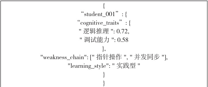 通过代码语义特征、错误模式聚类、结题行为序列三个维度的数据采集,形成用户画像。通过 DeepSeek 解析代码语义特征,分析抽象语法树,识别算法逻辑错误如循环边界错误、递归终止条件缺失等;根据用户提交记录中的错误情况进行聚类分析,发现错误类型和频率,统计学生的共性弱点如数组越界、状态转移方程错误等,标注为知识弱点标签;最后根据学生题目的提交顺序,评估学生的问题解决策略。通过关系图驱动的认知诊断模型 [8](Relation Map Driven CognitiveDiagnosis, RCD)结合以上数据构建学生认知训练标签,形成用户画像。针对同一用户,每产生 5 次提交操作更新一次弱点标签。用户画像具体结构如表3 所示。