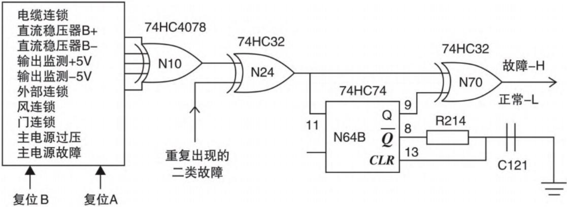 ⑤ 调制编码板电缆连锁和功放连锁保护:当连锁插座连接出问题时,或门 N21A 输出为高电平,经反相器输出低电平。电容 C120 经R118 放电延迟(避免瞬时故障导致触发一类故障关机),延迟后输出高电平到N10 进行电缆连锁和功放故障关机。同时由于故障输出时同时显示电缆连锁和功放(因为还检测直流稳压板的X2 端口插接),因此要分清属于哪个故障保护,利用万用表测量两个连锁到或门 N24A的输入,输入为高的即为故障保护。故障多发生在发射机进行维护或功放模块维修后出现,此时应检查调制编码电缆的插头和插座接触是否良好,功放模块是否插到位;