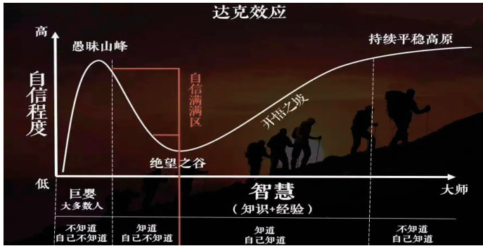 达克效应(D-K effect),全称为邓宁 - 克鲁格效应(Dunning-Krugereffect),是由邓宁(David Dunning)和克鲁格(Justin Kruger)提出的一种认知偏差现象。大意上是指一个人在没有获得知识的时候,是自卑的;随着知识的积累,自信度也不断增加,而最自信的时候,恰恰是他刚刚获得了一点知识的时候,即“愚昧之山”之时;然后不断接触到新鲜的事物与知识,自信度也会下降,直至掉入“绝望之谷”,然后继续学习,开始攀爬“开悟之坡”,最终成为某一领域之大师。