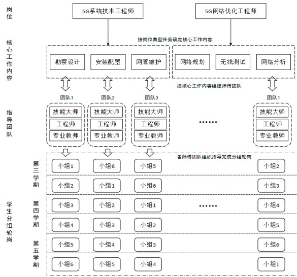 开展“学徒 -- 助理工程师 -- 工程师”工学交替的教学形式。第一阶段主要完成公共基础课程模块课程和企业认知的学习,初步接触工作岗位,实现从学生到学徒身份的转变。第二阶段包含 3 个学期,每学期前6 周在学校学习理论知识,7-18 周到企业开展轮岗学习,初步掌握岗位知识和技能,并考取职业资格认证,达到助理工程师水平。第三阶段开展企业顶岗实践和基于企业真实工程项目的毕业设计,完成对理论知识和岗位技术技能的综合梳理与提升,成为合格的 5G系统技术工程师、5G 网络优化工程师。