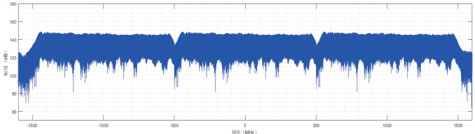 图 2 显示的是使用雷达信号模拟器向干扰产生软件输入雷达模拟信号,设定干扰中心频率为 1350MHz,干扰带宽为 3GHz,所生成的雷达干扰信号的频谱图。可以看到,干扰源产生的强大信号噪声信号占据了较大的频谱宽度,能在频域上对正常的通信信号形成压制效果。