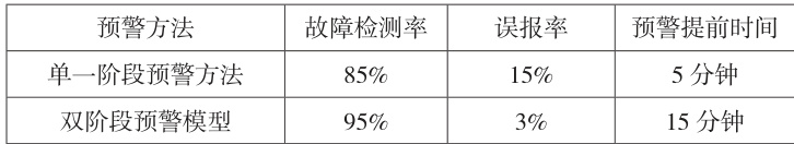 为了评估双阶段预警模型的性能,本文将双阶段预警模型与传统单一阶段预警方法进行了对比分析。对比结果表明,双阶段预警模型在故障检测率和误报率方面均优于传统单一阶段预警方法。具体对比结果表3 所示.