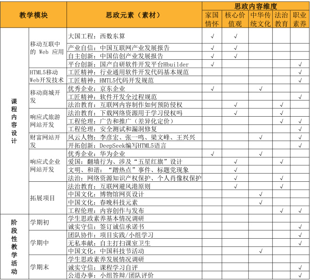 以《HTML5 前端应用项目开发 +Bootstrap UI 框架》课程课程思政实践情况来分析,学生的社会责任感、法治意识、人文素养以及职业素养显著提升,通过大国工程、信创平台、产业发展分析等内容提升了学生民族自豪感与产业自信心;通过签订诚信承诺书、课程学习自评、团队评价、“蹭热点”事件、翻墙行为等思政内容学习让学生树立了正确的价值观;通过优秀企业、风云人物、博物馆网页设计、科技节活动等思政内容学习让学生得到中华优秀传统文化的浸润;通过网络内容复制、网络资源下载、互联网避风港原则等思政内容学习提升了学生法治意识;通过代码规范、项目规范、项目实践、项目答辩、团队考核等思政内容学习提升了学生职业素养和职业道德水平。