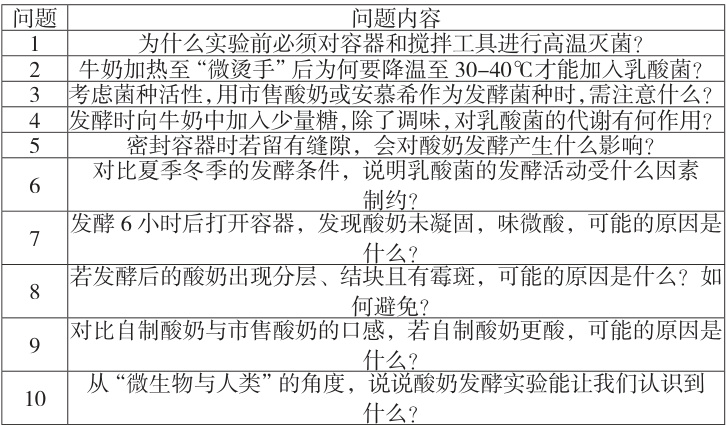 环节 3:教师围绕酸奶发酵核心环节,以层层递进的问题链(可根据学生基础择优选用)引导学生探索(表 1-1),但不局限于表格中的问题[4]。