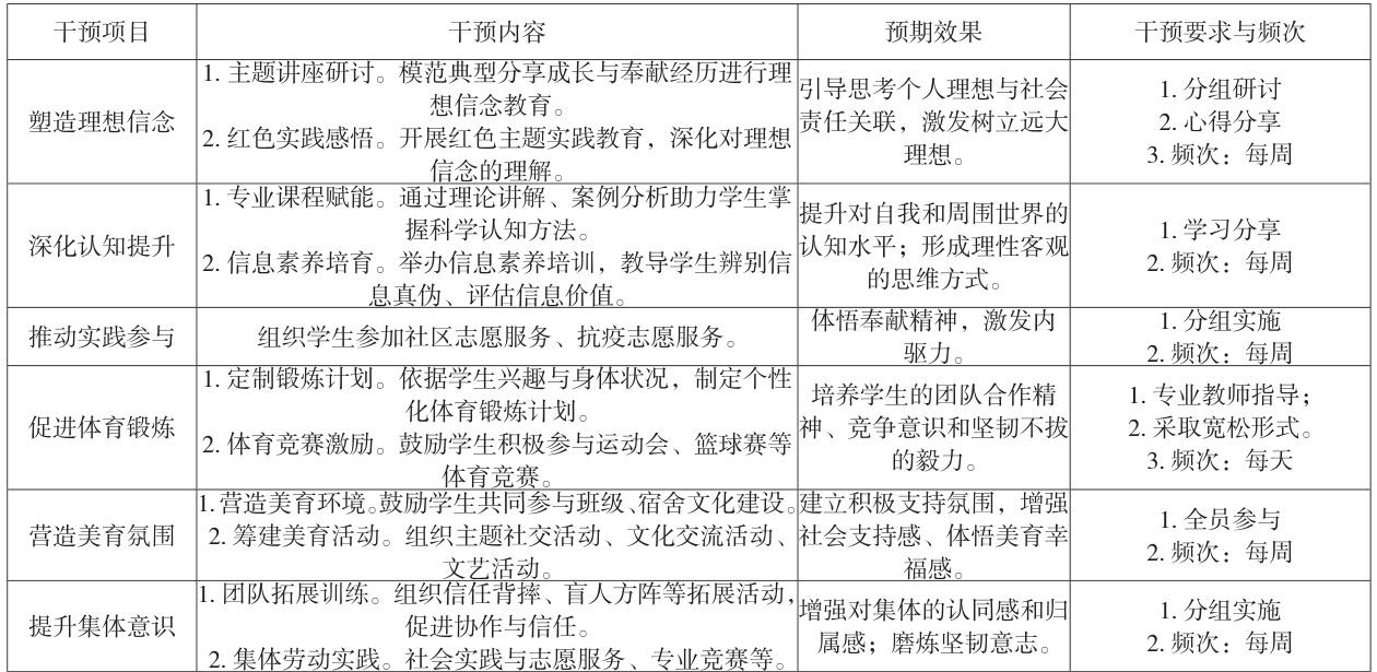 1、加强信念教育以激发内驱动力,实现以德育心。一是,强化理想信念教育,激发信念伟力。理想信念是人的精神支柱,能够赋予人强大的精神动力,助力大学生在面对困难和挑战时展现积极向上的态度。通过理想信念教育引导学生理清个人与社会、个人与国家的关系,明晰肩负的责任和使命,进而激发为实现理想而奋斗的内驱动力。二是,弘扬精神力量,增进行动追随。以社会主义核心价值观为指引,弘扬中华优秀传统文化与爱国主义精神。通过伟大建党精神、抗疫精神等精神谱系的宣扬和感人事迹的传颂,引导学生坚定理想信念,树立正确价值观念,培育积极向上、奋发有为的品质。同时,鼓励学生积极参与志愿服务和社会实践,使得学生在实践中体悟服务他人、奉献社会的快乐,增强内驱动力。有研究表明,参加社会实践较多的学生比参加少的学生表现出了较高的积极心理品质水平 [6]。