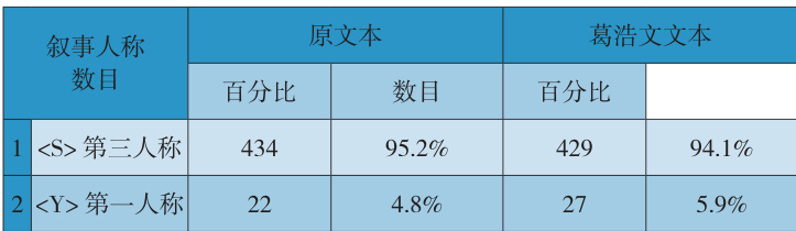 在《叙事学导论》中,叙事人称主要被划分为第一人称和第三人称。根据研究结果显示,《红高粱》及其译本中的 456 个段落中,第三人称叙述占据主导地位,呈现出原文和译本在叙述人称上的高度一致。本研究对《红高粱》及其译本的 456 个段落进行了叙事人称的标注,统计结果详见表1-1。