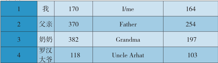 通过对表 1-1 和表 1-2 的数据进行分析,我们可以看到第三人称叙述的更多细节。尽管在原文和葛译本中,第三人称叙述的比例都超过了 90% (见表 1-1),但表 1-2 的数据却显示出原文中的第三人称叙述对象呈现出了丰富的多样性。比如,“父亲”、“奶奶”和“罗汉大爷”在全文中分别出现了 370 次、382 次和 118 次,这种多角度的叙述为小说增添了更多色彩。在葛译本中,第三人称叙述同样呈现出多样性,但与原文相比,除了 UncleArhat 出现了 103 次,与原文中的“罗汉大爷”118 次相仿外,其他两位叙述人物的出现频率都有所下降。