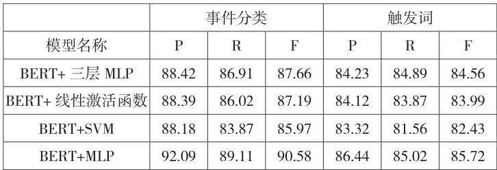 事件检测任务建模为多分类任务,所实现的对比模型及效果见表3,