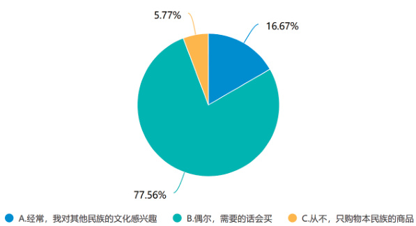 从经济维度分析,针对“是否愿意购买其他民族的特色商品”,16.67% 的居民表示“经常,我对其他民族的文化感兴趣”, 77.56% 的居民表示“偶尔,需要的时候会买”,体现了社区居民对其他民族的特色商品具有较强的购买意愿和接受程度(见图 2)。针对“社区是否开展过就业技能培训”,一半以上的居民表示“有,听说过”,反映了社区提高居民收入、提升居民生活水平方面,为民族团结、民族共融提供物质基础。