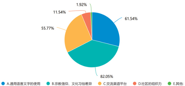 此外,针对“影响不同民族间交流互动的因素”, 82.05% 的居民认为是“宗教信仰、文化习俗差异”,一半以上的居民认为是“通用语言文字的使用”和“交流渠道平台”(见图4)。