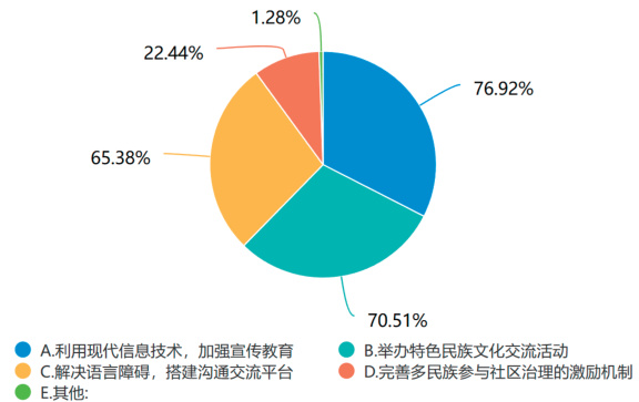 调研“社区提升居民对其他民族文化的理解及集体认同感的方式”, 76.92% 的居民认为通过“利用现代信息技术,加强宣传教育”,70.51% 的居民赞同“举办特色民族文化交流活动”,另外有 65.38% 的居民认为要“解决语言障碍,搭建沟通交流平台”(见图5)。