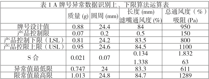 根据拉依达准则,某牌号 A 烟支物理指标假设生产过程按中心值生产控制,检验仪器性能符合计量要求,其异常数据识别上、下限如下表1: