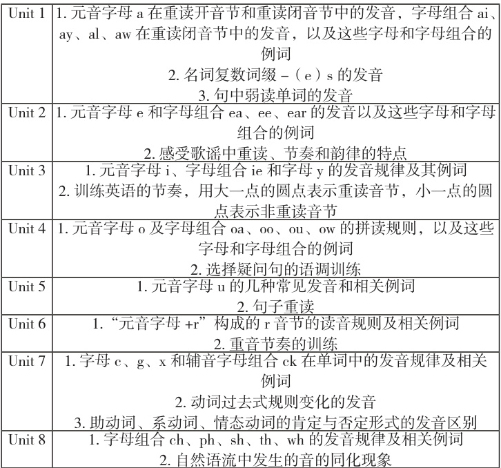 人教版新教材七年级下册语音重点关注字母及字母组合的拼读规则。其中前五个单元依次介绍元音字母 a、e、i、o、 u 及其字母组合的读音,第六个单元介绍五个元音字母与字母 r 组合的发音,最后两个单元介绍辅音字母及辅音字母组合的发音。语音知识在人教版新教材七年级下册各单元的分布如下: