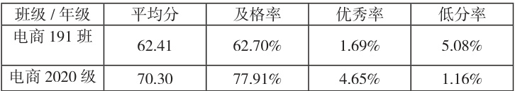 在活页式教材支持下,有效运用 BOPPPS 教学模式,学生以学习团队为单位,共同完成各阶段学习任务,使得课程教学质量有了显著提升。 2019 级、2020 级学生的一分三率如表 1 所示,可以看出,电商20 级的平均分、及格率、优秀率均有较高幅度的提升。