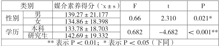 表 1 不同性别和学历的医学生媒介素养得分