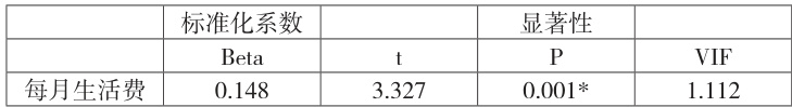 对性别、年龄、学历和每月生活费进行双变量相关分析发现,四者均对媒介素养有显著影响( P<0.05 )。回归分析显示,每月生活费的 P<0.05 且 Beta 值为 0.148,说明每月生活费对医学生的媒介素养有显著影响且呈正相关关系(见表5)。
