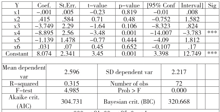 根据多元回归分析结果可知,模型为:Y=8.07-0.001X1+0.415X2-3.749X3-8.895X4-1.139X5+0.031X6+ei