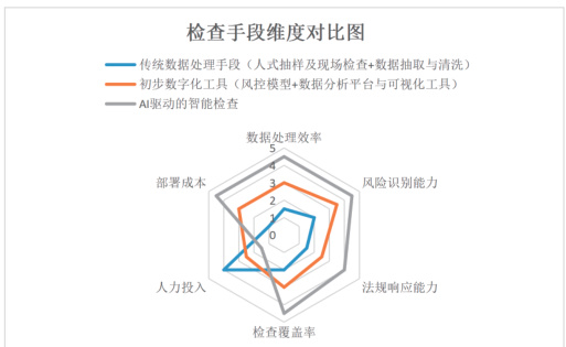 将检查手段分为三类:一是传统数据处理手段,即人工抽样或现场检查;二是初步数字化工具,即数据抽取与建立风控模型;三是AI 驱动的智能检查。从数据处理效率、风险识别能力、法规响应能力、检查覆盖率、人力投入及部署成本六个维度进行分析,每个维度的评分范围为 0 至 5 分,其中 5 分为最高分。从对比结果来看,第一类传统数据处理手段,虽然具备较强的合规验证能力和一定的操作灵活性,但其效率低、覆盖面窄,难以适应日益复杂的金融业务与监管要求;第二类初步数字化工具,在一定程度上提升了风险识别的自动化水平和工作效率,但在面对隐性风险、复杂交易结构和动态变化的监管政策时仍显不足,模型规则相对限定,缺乏风险监测的灵活性和智能化判断能力。相比之下,第三类 AI 驱动的智能检查在多个关键维度上展现出明显优势:一是数据处理效率大幅提升,能够自动完成大规模数据的抽取、清洗与分析;二是风险识别能力更强,借助机器学习和深度学习技术,可从海量数据中挖掘潜在风险,实现前瞻性预警;三是法规响应更加灵活及时,AI 模型可快速适配新规变化,提升合规管理的敏捷性;四是检查覆盖率显著提高,通过全流程自动化监测,覆盖更多业务节点和交易行为;五是大幅降低对人工重复劳动的依赖,节省人力成本,使专业人员能更专注于高价值的风险研判与决策制定。(图1)