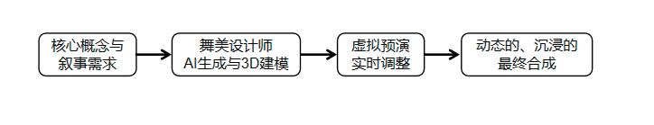 当舞台作品开启正式制作,预先排演属于核心的制作部分,针对布景复杂、表演难度大的舞台制作,线下实体排练开销大且风险大,AI 和虚拟仿真技术相互结合,为舞美创作实践开拓技术驱动新手段,依靠虚拟演出平台进行全流程的排练和预演优化,先利用虚拟环境对演出进行预演模拟,然后用智能算法做精确调整,保证线下制作能够顺利进行。