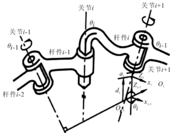 建立机械臂模型需要用到 4 个参数,即连杆长度 u、连杆扭角 a、两连杆距离 d、两连杆夹角 B。连杆长度指连杆上两个关节轴线的最小距离 ; 连杆扭角指两关节轴线的夹角 ; 两连杆距离指关节轴上两个法线的距离;两连杆夹角指关节轴上两个法线的夹角。连杆四参数示意图如图3 所示。