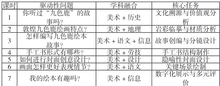 本项目以“如何创作一本‘九色鹿’题材绘本?”为驱动性问题,融合美术、语文、历史、地理、劳技、信息等学科,共 7 课时,逐步推进绘本创作。