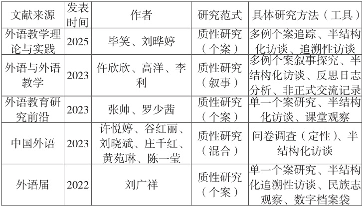 表 1:外语教师身份认同建构研究的研究方法运用情况(2015-2025)