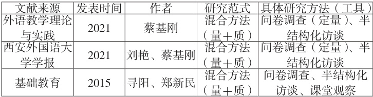 本研究围绕 “外语教师身份认同” 主题,于中国知网(CNKI)检索文献,筛选范围限定为中文社会科学引文索引(CSSCI)来源期刊。依托 CSSCI 期刊的学术权威性,此标准有效保障文献质量。研究按主题相关性与方法论适用性筛选,最终确定 8 篇代表性文献(见表 1)。现有研究主要有三类方法论范式:1)单一质性研究设计;2)混合质性方法策略;3)质性与量化混合研究。虽部分研究融合质性与定量方法,但本研究后续分析仅聚焦质性部分。