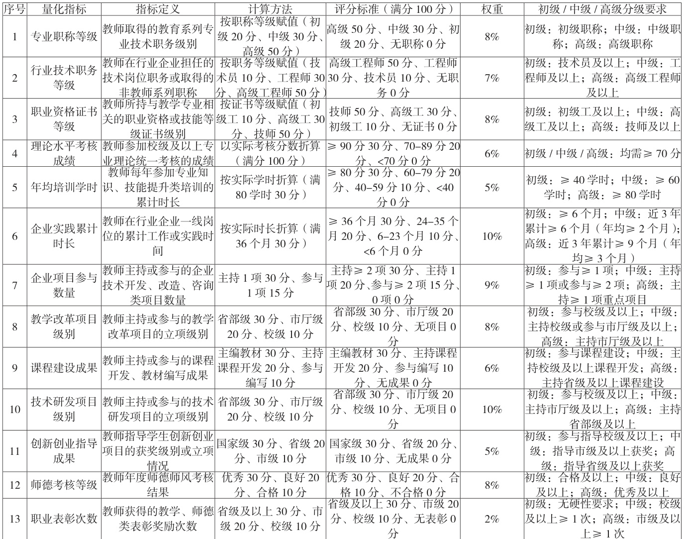 资格资历包含三个指标。专业职称要求教师具备相应级别的专业技术职务,关注教师在行业企业的任职情况;职业资格证书强调教师持有与专业相关的职业资格认证。