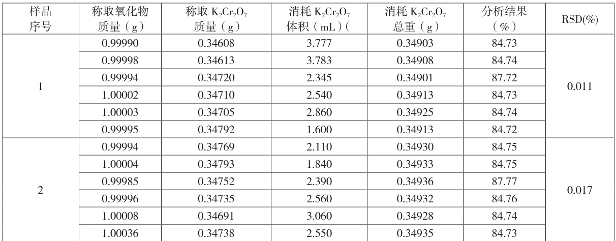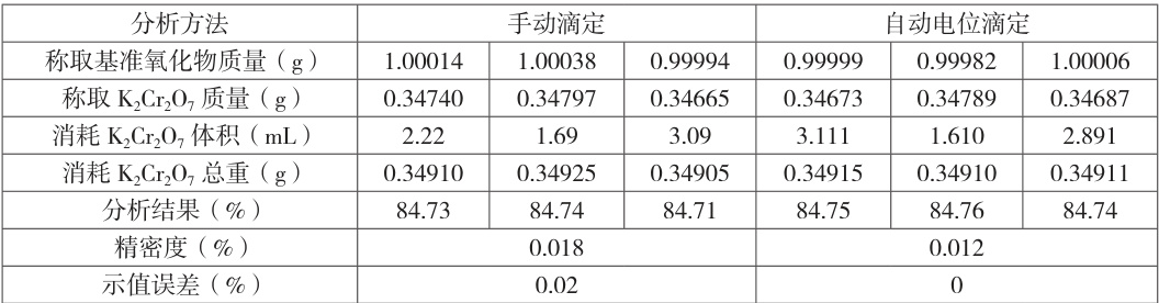 表2 结果表明:自动电位滴定仪参数设置合理,测试结果精度好,分析结果的相对标准偏差优于 ±0.025% ,满足要求。