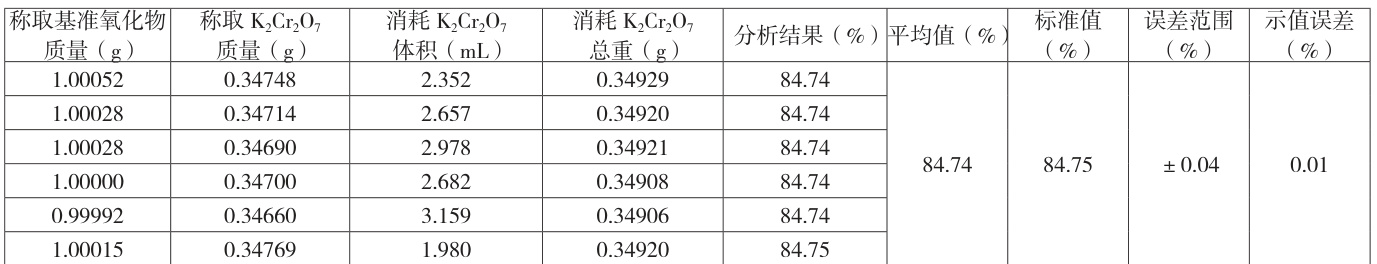 称取约 1g 基准氧化物于 400mL 高型烧杯中,按 2.4.1~2.4.9 步骤进行操作。实验结果见表3。