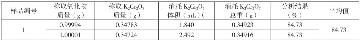 氟化物经水解、蒸干、灼烧转化成氧化物固体,将固体氧化物用磷酸溶解,在磷酸介质中用硫酸亚铁还原,在合适的温度下以钼(Ⅵ)作催化剂,用硝酸氧化过量的亚铁,加氨基磺酸除去氧化过程中产生的氮氧化物。在硫酸氧钒的存在下,用重铬酸钾溶液滴定至终点,由此精确计算出氧化物中的主成分。