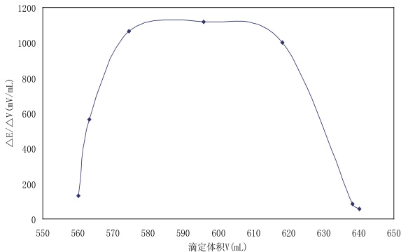 ΔV 对滴定剂的体积(V)作图,通过实验,最终设定阈值为 600mv/ mL 。