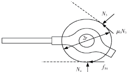 自锁防滑装置部件的受力分析见图 2。对滚轮进行受力分析,可以得到:
