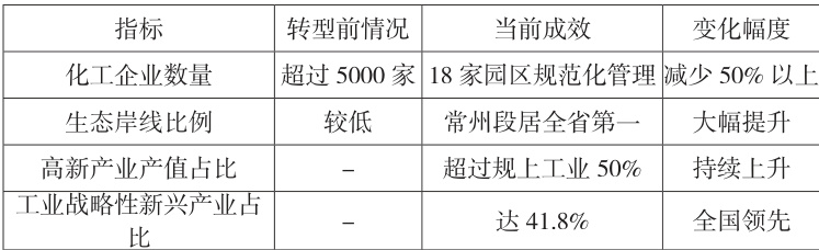 江苏以壮士断腕的决心推动产业结构优化调整。近年来,全省取消 24 家安全环保基础设施薄弱、综合管理水平不高的化工园区、沿江八市化工园区数量由 37 家压减至 18 家、关闭安全环保不达标化工生产企业 3877 家、全省化工企业入园率由整治前的 29% 提高到50.5% 、规上化工企业占比由 58.5% 升至 82.1% 。沿江区域特别是曾经面临“化工围江”沉疴的新北区,通过建立“企业退出—生态修复—指标调剂—异地使用”空间补偿机制,关停腾退低效化工企业,使4000 余亩工业用地重获新生。