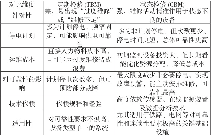 当前,10kV 铁路电力系统普遍采用以定期检修(TBM)为主的传统维护模式,即按固定周期对设备进行例行检查与试验。该模式虽能预防部分故障,但其弊端日益显著:缺乏针对性的维修易导致“过度维修”或“维修不足”,且计划性停电频繁,与铁路供电高连续性要求严重冲突。被动式的故障后维修更会直接威胁行车安全。为突破传统模式的局限,向状态检修(CBM)转型势在必行。状态检修依据设备的实时健康状态安排维护活动,通过传感器、在线监测等技术手段,精准判断设备劣化趋势,仅在必要时才进行维修。表 1 系统对比了两种模式的核心差异。