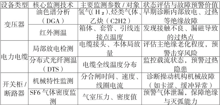 状态检修的有效实施高度依赖于对设备健康状态的精准感知与科学评估。对于主变压器,油色谱分析(DGA)是监测内部潜伏性故障最有效的手段之一;红外热像技术则可用于普测导线连接点、开关设备等的外部过热缺陷。对于长距离电缆线路,局部放电检测和分布式光纤测温(DTS)技术能够实时感知绝缘劣化与载流异常。开关设备则需关注其机械特性和灭弧能力,可通过行程特性监测和 SF6 气体密度监测进行判断。这些监测技术获取的海量数据需通过专业的评估方法转化为有效的维修决策。目前,普遍采用基于阈值判据的综合分析方式,并结合历史数据趋势进行判断,从而实现对设备健康状态的分级评估和早期故障预警。如表 2 所示,为 10kV 铁路电力系统主要设备状态监测技术的应用要素。