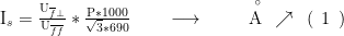 一般的,考虑到计算值与实际值存在偏差,按设计值的 1.1 倍的Is 电流容量选型定子短接接触器即可满足设计应用要求,不会出现因定子短接接触器容量不足,导致触点黏连情况发生。以 1.5MW 双模机组举例,假定异步鼠笼模式下最大发 300kW 功率,电机转子开口电压是1900V,定子侧上网电压为 690VAC,计算过程如下 :