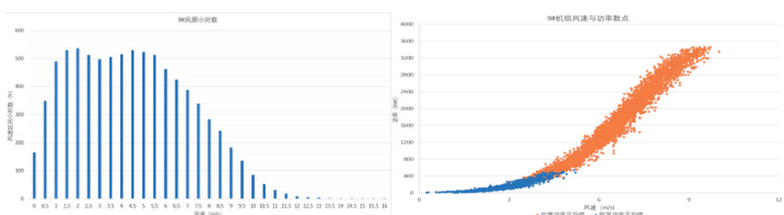 图 7 完整年风频和双模改造前后风速 - 功率散点图