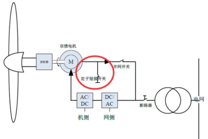 利用风电场项目现有设备条件,提升机组低风速段发电功率。双模发电系统的电气拓扑结构,包括在双馈发电机的定子与定子并网开关之间增加一个定子短接开关的设计思路,以及这种设计如何实现两种发电模式的切换 [3]。