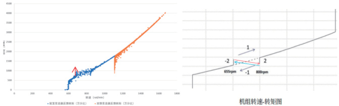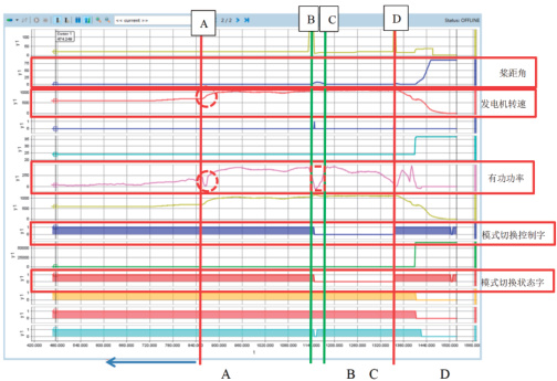 ④ .功率继续提升:机组在 B 时刻发电机转速 1200rpm ,有功功率 450~500kW 之间到达鼠笼与双馈切换条件,在后续定版主控程序可实现切换功率值可调;