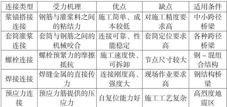 装配式桥涵节点连接技术可根据连接方式和受力机理分为多种类型,每种类型都有其特定的适用条件和优缺点。