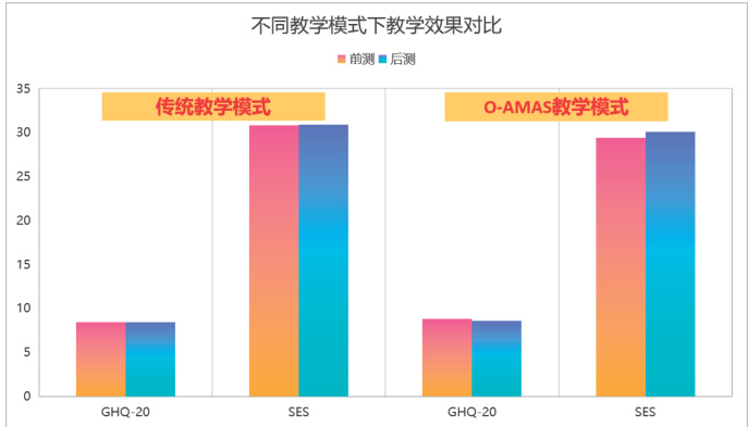 图 1 为不同教学模式下的教学效果对比图。教学效果通过 GHQ-20 和 SES 量表得分进行预测。采用以讲授为主的传统教学模式进行授课的班级 GHQ-20 量表前测得分为 8.47,后测得分为 8.40;SES 量表前测得分为 30.8,后测得分为 30.9;前后测得分变化极小,GHQ-20 量表得分仅下降了 0.07,SES 量表得分仅提高了 0.1。以上数据结果表明,以传统教学模式进行授课学生的身心健康水平和自尊水平几乎没有明显改变,教学效果不明显。采用 O-AMAS 教学模式进行授课的班级 GHQ-20 量表前测得分为 8.81,后测得分为 8.59;SES 量表前测得分为 29.4,后测得分为 30.08;前后测得分相比较,GHQ-20量表得分下降了 0.22,约为对照组下降值的 3 倍,SES 量表得分提高了 0.68,约为对照组提高值的 7 倍。以上数据结果表明,以 O-AMAS教学模式进行授课学生的身心健康水平和自尊水平提升较高,教学效果显著。以上实验结果验证了 O-AMAS 教学模式相比传统授课模式在提升教学效果上的优势。